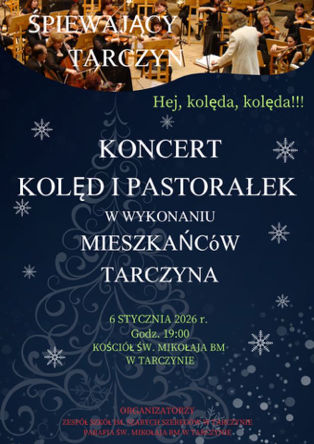 W poniedziałek 5 stycznia – Wola Przypkowska od 9.30 – trzech księży. - 6 stycznia, w Trzech Króli, po Mszy Świętej o 18.00 zapraszamy na koncert kolęd i pastorałek w wykonaniu mieszkańców Tarczyna. Organizatorem jest Zespół Szkół im. Szarych Szeregów w Tarczynie. Plakat.